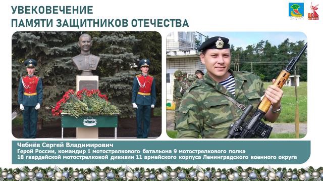 «За мужество и героизм, проявленные в ходе выполнения боевых задач в зоне специальной военной операции, наши воины удостоены высоких государственных наград. К сожалению, среди них есть и погибшие воины. Их имена навечно внесены на стену у мемориала «Родина-мать» у Вечного огня. Высокое звание Героя России присвоено нашему земляку Сергею Чебневу, который ценой своей жизни спас сотни своих сослуживцев. В память о подвиге Героя на Аллее Славы парка Победы и в школе 56, где учился Сергей, установлен бюст».