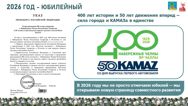 В 2026 году город отметит два масштабных юбилея – 50‑летие со дня выпуска первого грузового автомобиля КАМАЗ и 400‑летие со дня основания Набережных Челнов. В планах – проведение серии торжественных и культурно‑массовых мероприятий, а также реализация проектов по благоустройству и укреплению инфраструктуры, которые подчеркнут историческое и экономическое значение этих дат для региона.
