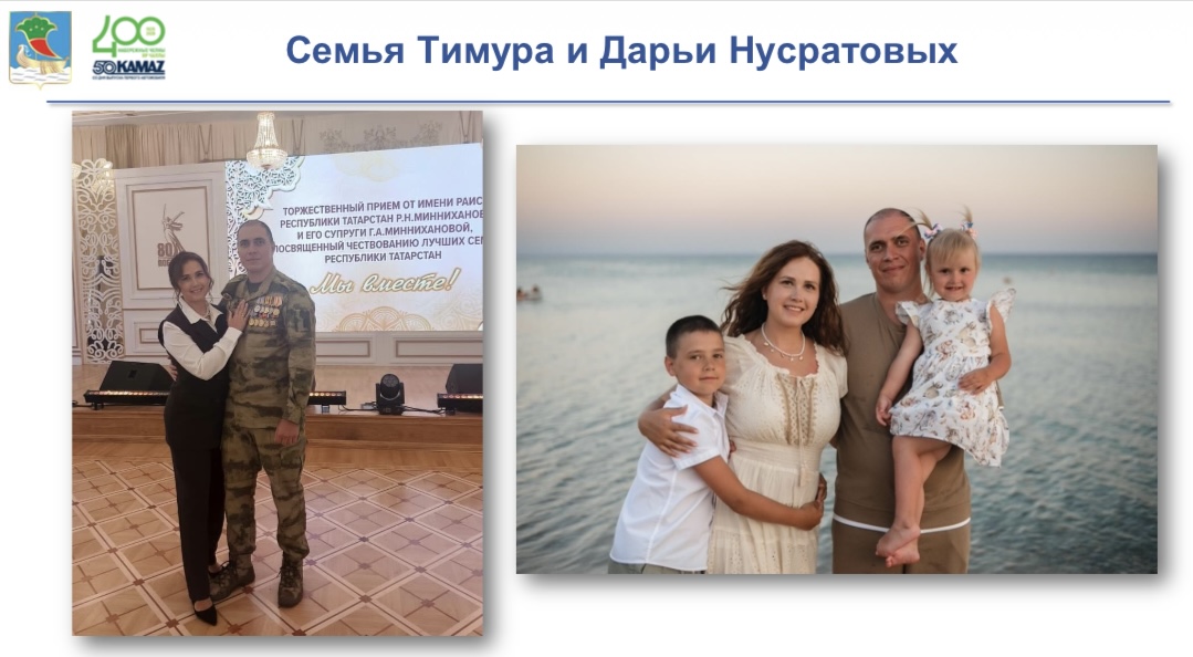 27 августа на Торжественном приёме лучших семей республики от имени Руководителя Республики Татарстан в Казанском Кремле наш город достойно представила семья Нусратовых. Тимур Эдуардович – участник специальной военной операции, награждённый боевыми медалями, а Дарья Викторовна – его надёжный тыл. Вместе они воспитывают двоих детей.