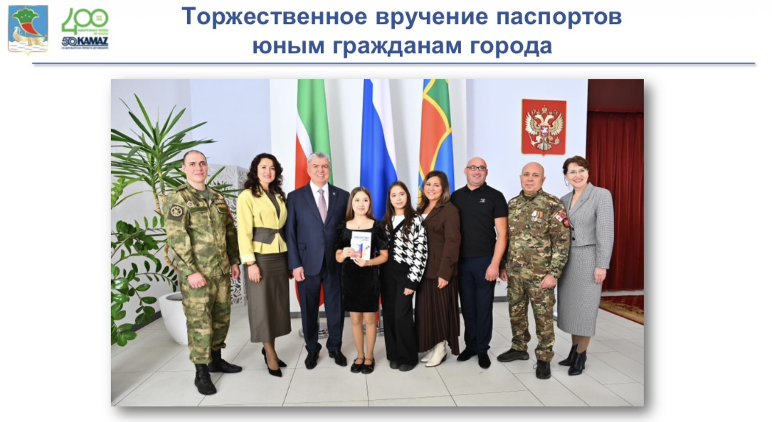 Особое внимание уделяется патриотическому воспитанию молодежи. Уже 11 лет проводятся церемонии вручения первых паспортов. В 2025 году около 700 подростков получили главный документ под гимны России и Татарстана в присутствии семей и руководства города. Каждый получает поздравительный адрес от имени мэра города.