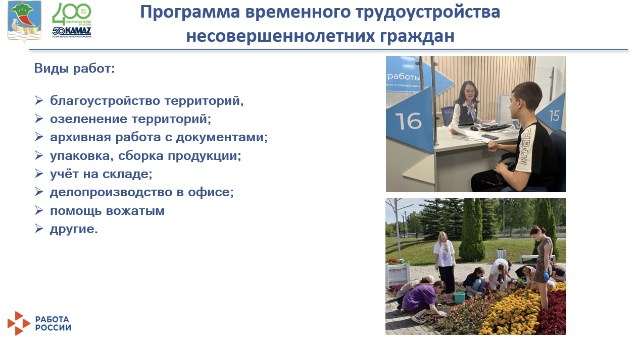 Среди промышленных и муниципальных предприятий лидерами по количеству принятых на временную работу подростков стали МУП «Парк культуры и отдыха», трудоустроившее 216 человек, и Прессово-рамный завод ПАО «КАМАЗ», принявший 80 человек. Также рабочие места предоставили «АлСтар Сервис» (ГК ТАТПРОФ), МУП «Горкоммунхоз», Набережночелнинская ТЭЦ и другие организации. Реализация данной программы направлена на раннюю профориентацию школьников, получение первого трудового опыта и закрепление молодых кадров в компаниях региона.