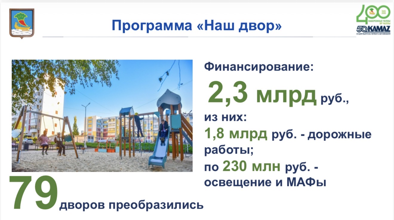 В рамках республиканской программы «Наш двор» благоустроено 79 придомовых территорий. Общий лимит финансирования составил 2,3 млрд рублей, из которых 1,8 млрд рублей направлено на дорожные работы, а по 230 млн рублей — на системы освещения и малые архитектурные формы. В ходе работ площадь благоустройства достигла 468,5 тыс. кв. м, установлено 1 455 опор освещения, 835 единиц детского и спортивного оборудования, а также более 3 тыс. элементов уличной мебели и парковочных ограничителей.