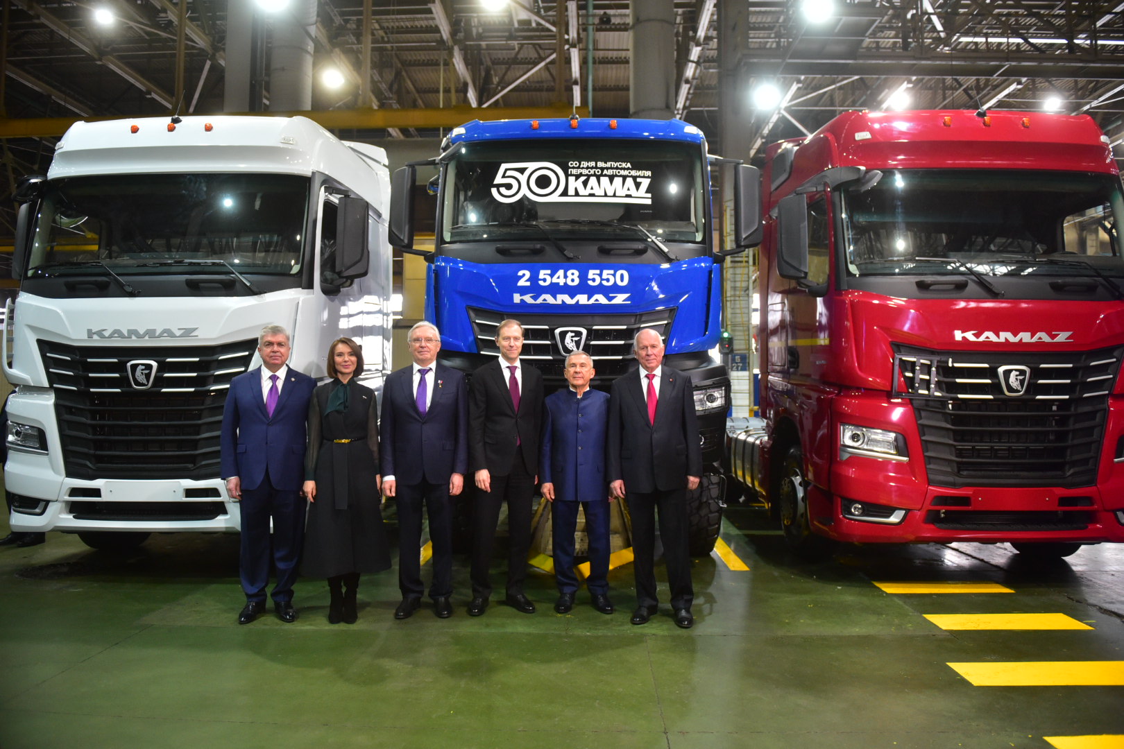 Первый заместитель Председателя Правительства Российской Федерации Денис Мантуров от имени Президента Российской Федерации Владимира Путина поздравил заводчан с 50-летием со дня выпуска первого автомобиля КАМАЗ и зачитал телеграмму от национального лидера. В своём поздравлении Владимир Путин отметил огромный вклад предприятия в развитие отечественного автопрома и машиностроения: за полвека КАМАЗ прошел впечатляющий путь развития, став одним из крупнейших производителей грузовой техники не только в России, но и за её пределами: