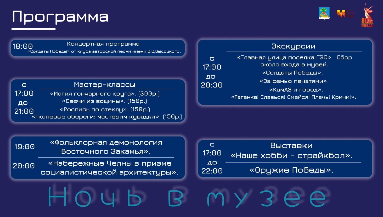 15 мая с 17:00 до 22:00 Историко-краеведческий музей приглашает всех желающих познакомиться с основной экспозицией. В программе — лекции, выставки, мастер-классы и тематические экскурсии. Для любителей пеших прогулок музей подготовил пешеходную экскурсию «Главная улица поселка ГЭС». В 18:00 состоится концертная программа «Солдаты Победы».