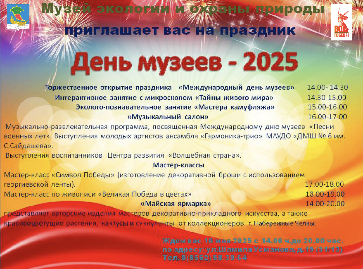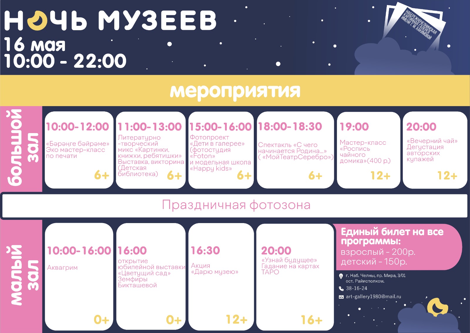 16 мая с 10:00 до 22:00 Набережночелнинская картинная галерея подготовила насыщенную программу. Торжественное открытие состоится в 16:00. На площади перед галереей развернется ярмарка мастеров декоративно-прикладного творчества. В 16:30 пройдет акция «Дарю музею». В 18:00 театральная студия старшего поколения «МойТеатрСеребро» представит спектакль «С чего начинается Родина». Для всех посетителей будут организованы интерактивные зоны, действующие экспозиции, а также бесплатный аквагрим для детей.
