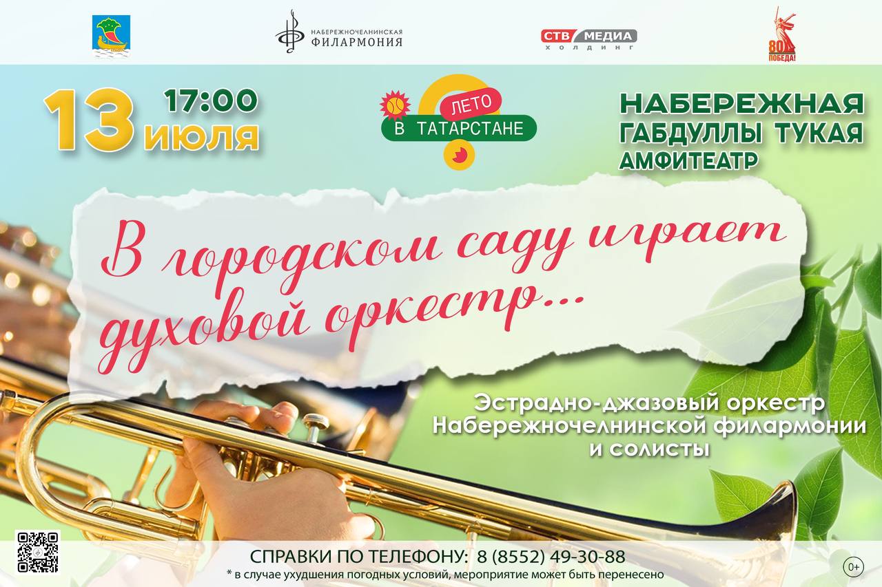 13 июля в 17:00 на набережной Тукая (амфитеатр) в исполнении Эстрадно-джазового оркестра Набережночелнинской филармонии и солистов Анны Меерсон, Ландыш Саубановой и Константина Нестерова прозвучат композиции из популярных кинофильмов, мелодии из отечественной эстрады XX века.