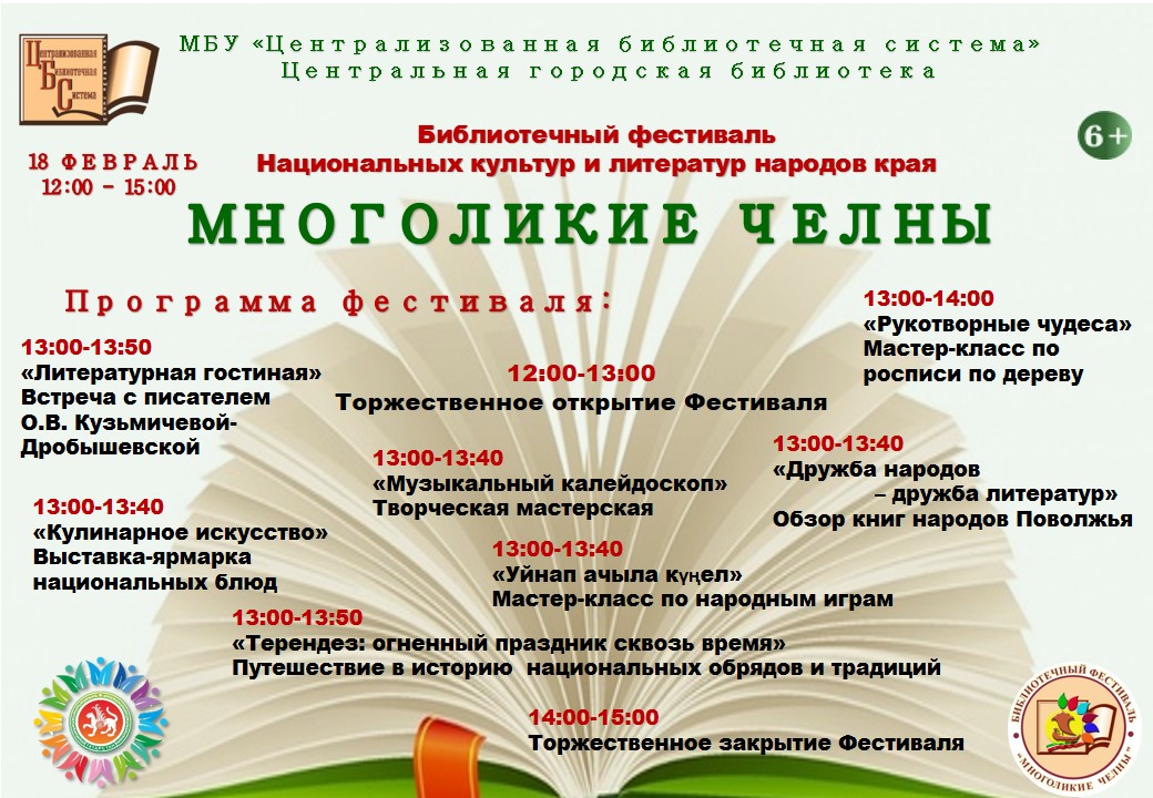 18 февраль көнне Үзәк шәһәр китапханәсендә Туган телләр һәм халыклар бердәмлеге елы кысаларында төбәк халыкларының милли мәдәниятләре һәм әдәбиятлары фестивале узачак. Кичәдә Яр Чаллы шәһәре территориясендә яшәүче төрле милләт вәкилләре катнашачак. Килүчеләр өчен төрле мәйданчыклар эшләячәк. Фестиваль кысаларында милли җәмгыятьләрнең, фольклор коллективларның чыгышлары, язучылар белән иҗади очрашулар, шигъри укулар планлаштырылган.