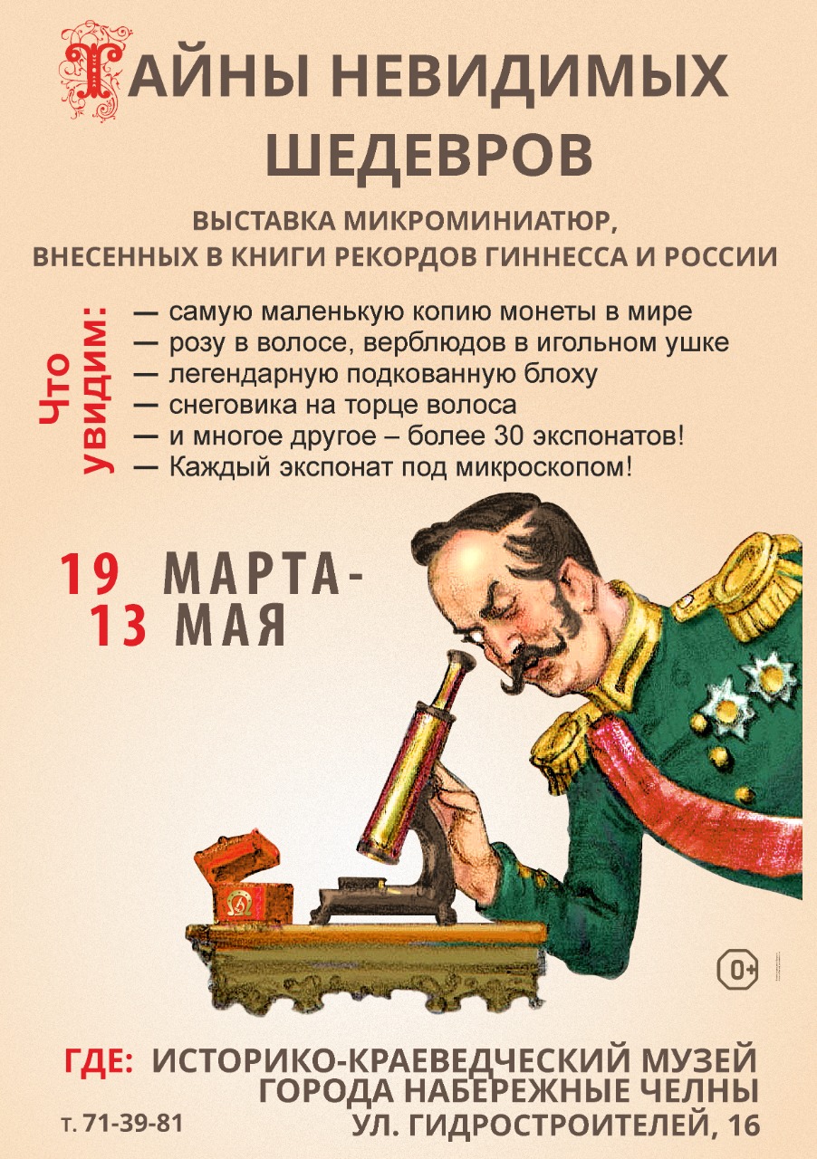 Яр Чаллы шәһәренең Тарихи-туган якны өйрәнү музее Новосибирск остасы Владимир Анискинның «Күрелмәгән шедеврлар серләре» исемле микроминиатюралар күргәзмәсен тәкъдим итәчәк. Күргәзмәдә останың 34 эше, шул исәптән «иң кечкенә тәңкә күчермәсе»н (Гиннесның рекордлар китабына кертелгән) күреп булачак.