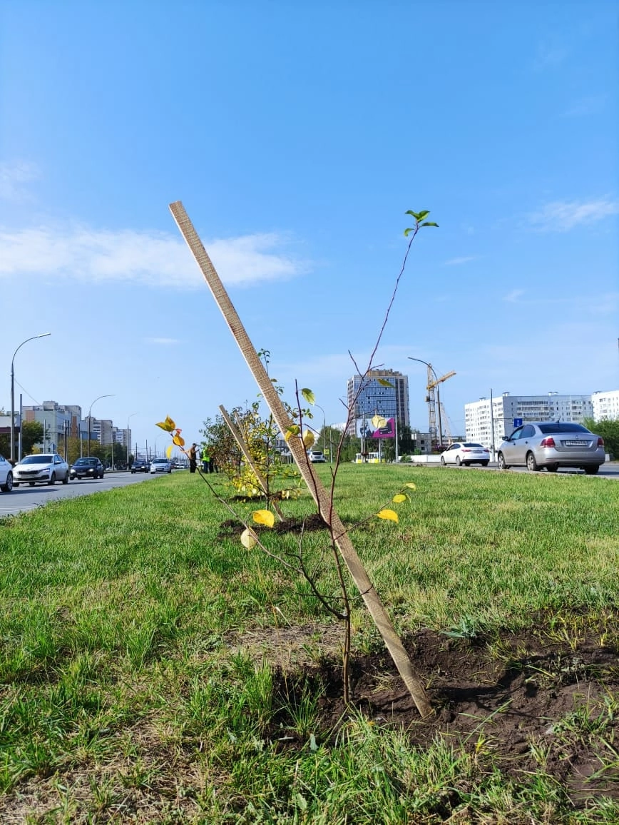 Район хакимияте хезмәткәрләре, "Бумажник" ТИҮ активы һем Горзеленхоз белгечләре җитәкчелегендә Яр Чаллы проспекты буендагы аеру полосасында 60 агач утырттылар.