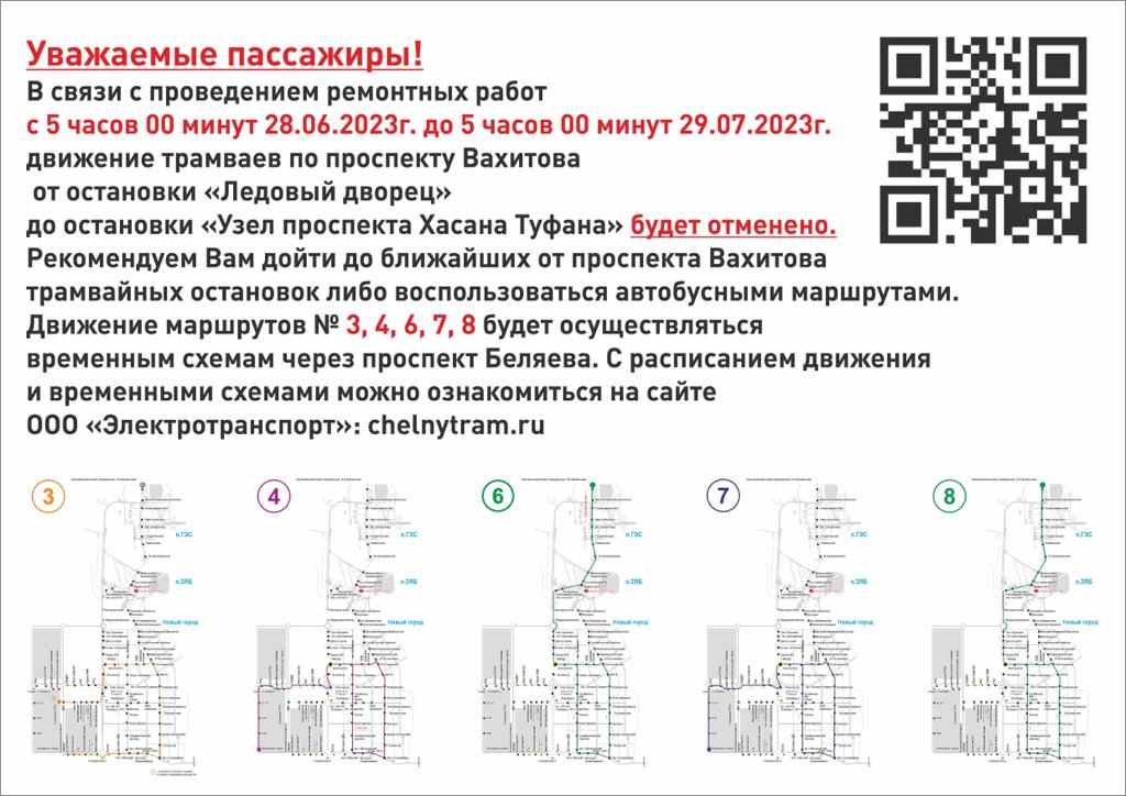 Вахитов проспектыннан иң якын трамвай тукталышына чыгарга яки автобус маршрутларыннан файдаланырга киңәш ителә. 3, 4, 6, 7, 8 маршрутлар хәрәкәте вакытлы схемалар буенча Беляев проспекты аша башкарылачак. Хәрәкәт расписаниесе һәм вакыт схемалары белән "Электротранспорт" ҖЧҖ сайтында танышырга мөмкин: chelnytram.ru